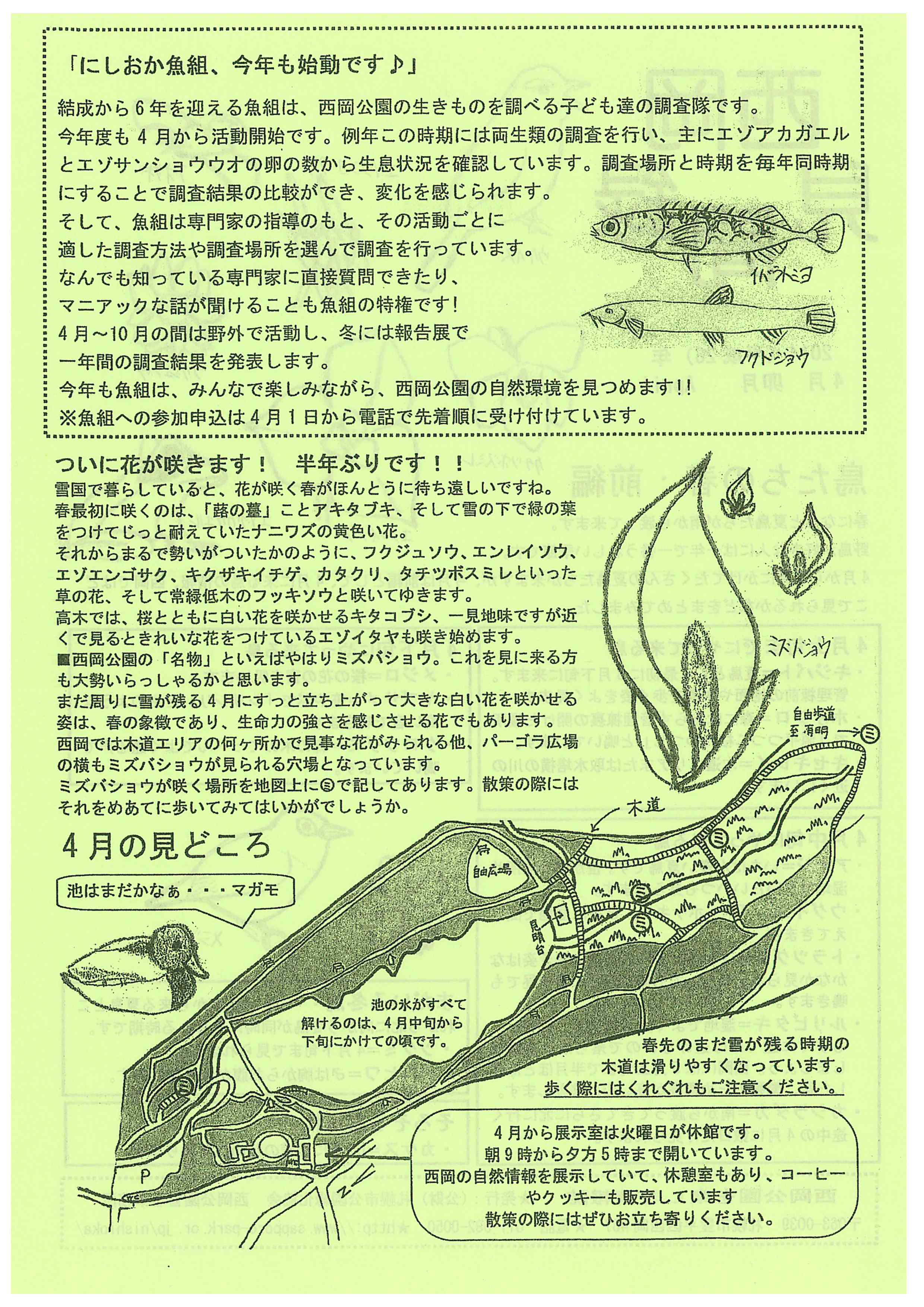 一方ウラ面では、今年も元気よく活動開始を予定している子ども調査隊「にしおか魚組」の活動紹介と、半年ぶりに顔を見せる木々や植物の紹介をしています。