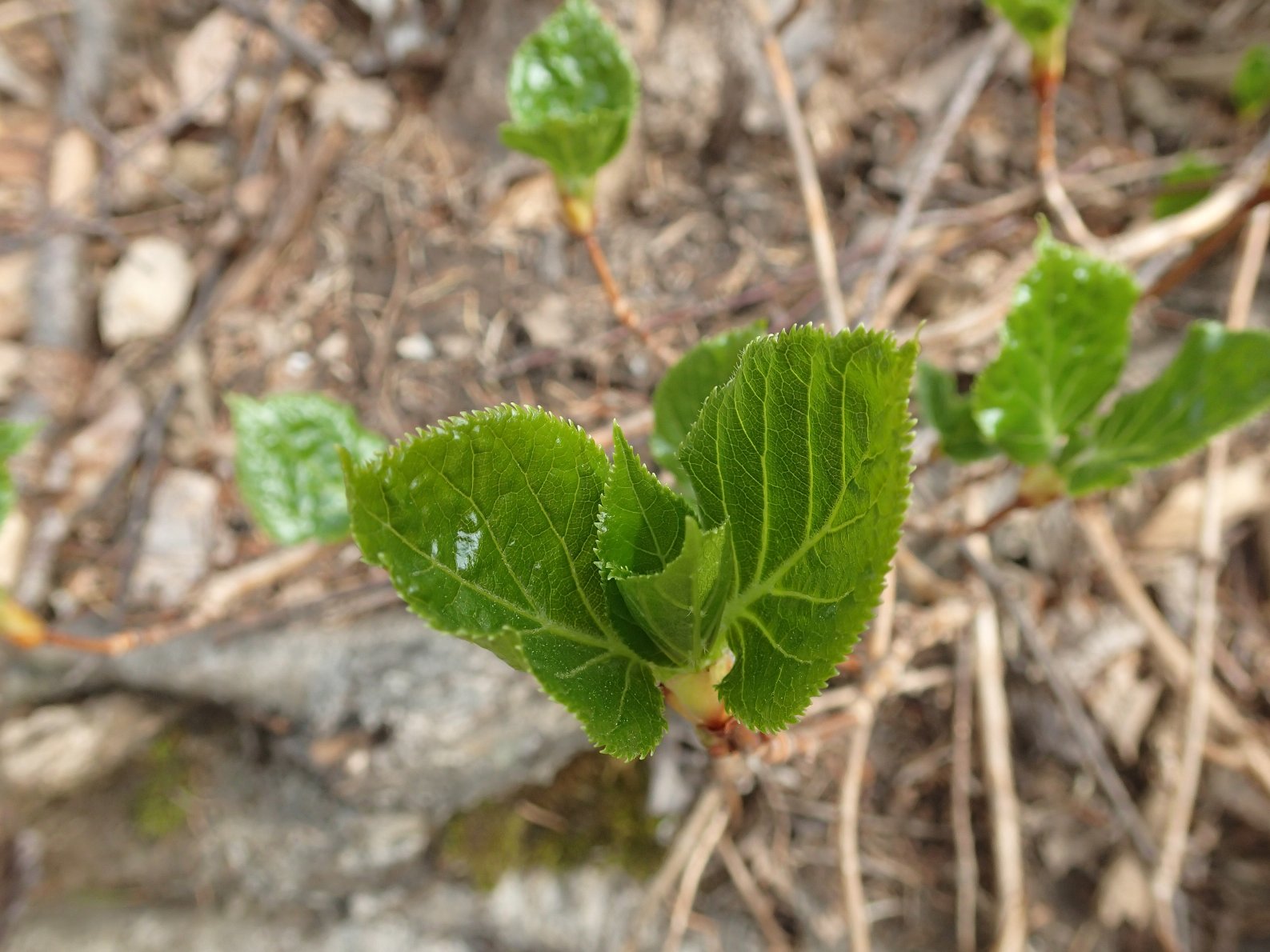 他の植物も、どんどん芽吹いています。 写真は、ツルアジサイの芽吹きです。他にも、エゾノコリンゴなどは 葉を出し始めていました。 他にも、マイヅルソウやエンレイソウの葉も出ていましたよ。 また、エンレイソウやエゾエンゴサクも開花しています。 これから、どんな花が咲くのか、楽しみですね。