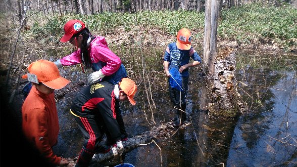 主に西岡公園にすむ両生類(エゾアカガエルやエゾサンショウウオ)の卵の数や、産む場所を記録しています。