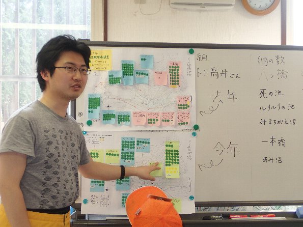 午後には2チームの調査結果を一つの大きな地図にまとめ(見つけた場所・数など)みんなで去年の結果と見比べながら、高井さんに解説してもらいました。