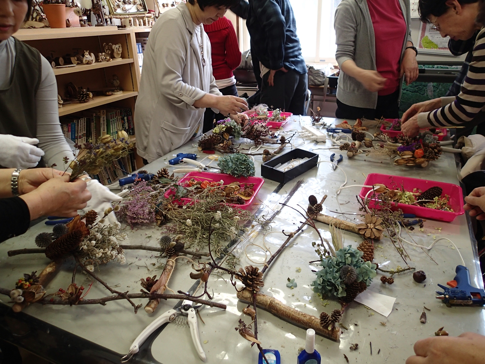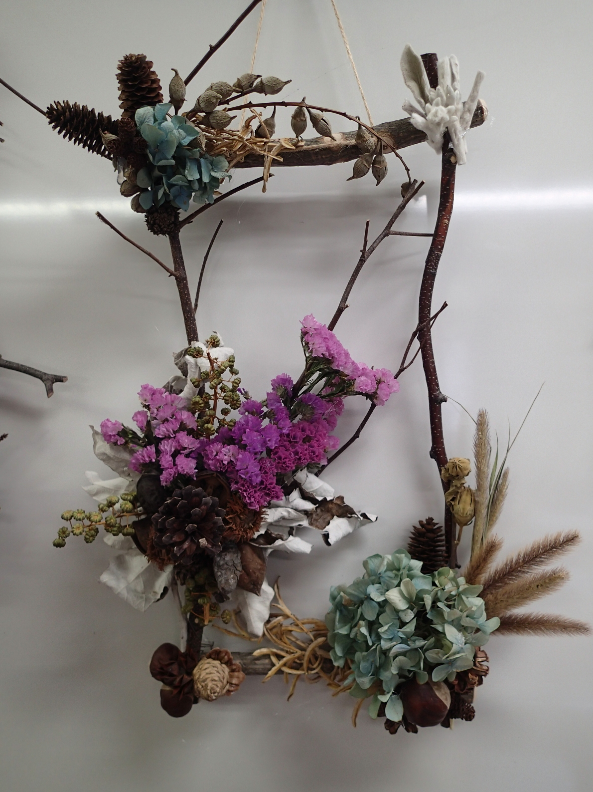 昨日は、今年度最初の「子りす工房~おとなの日」で、 去年作った花壇の花のドライフラワーを使って、壁掛けを作りました。