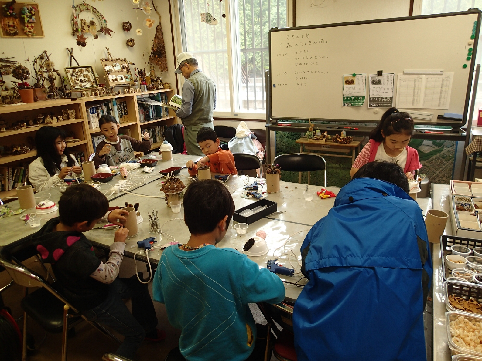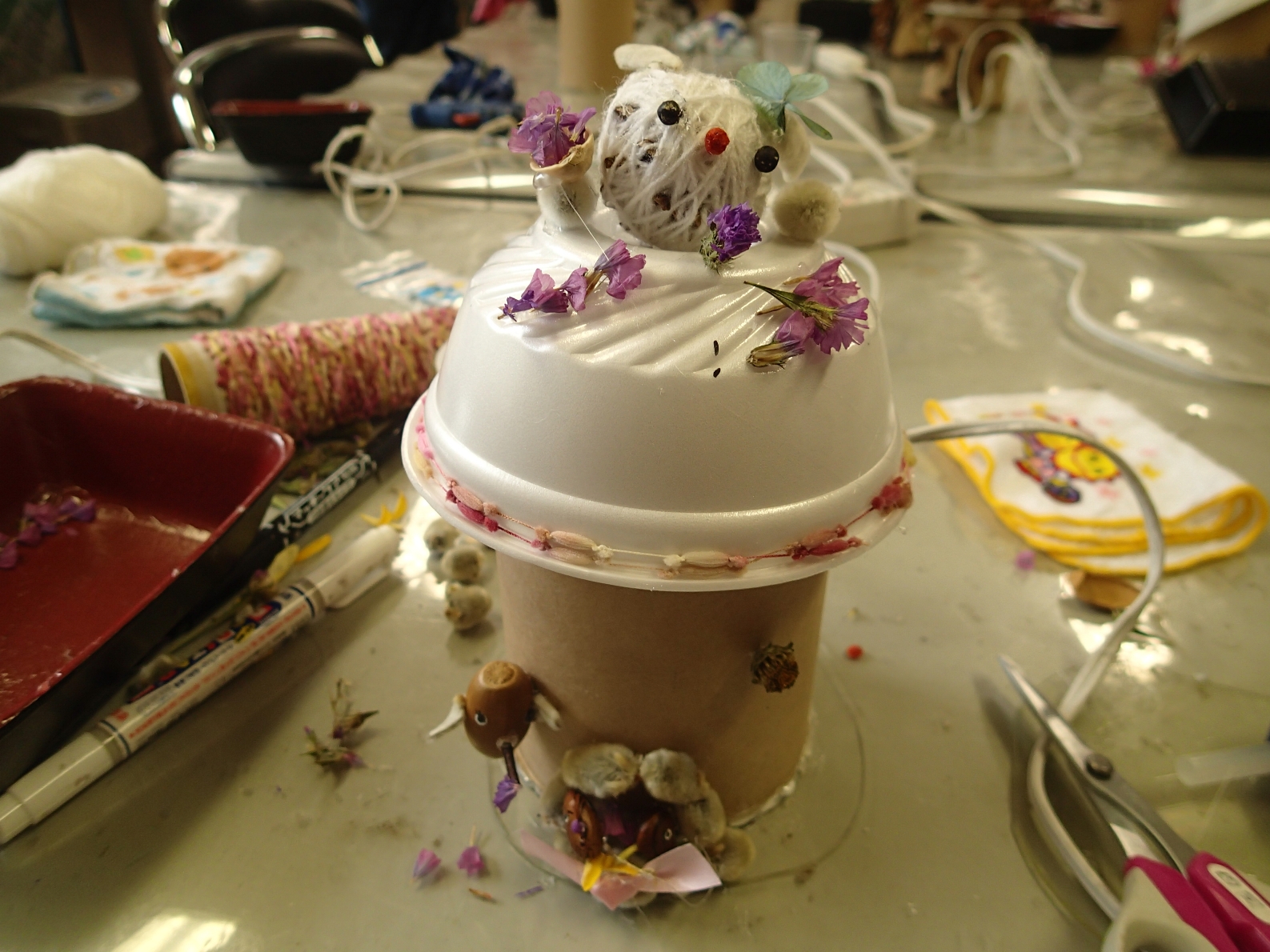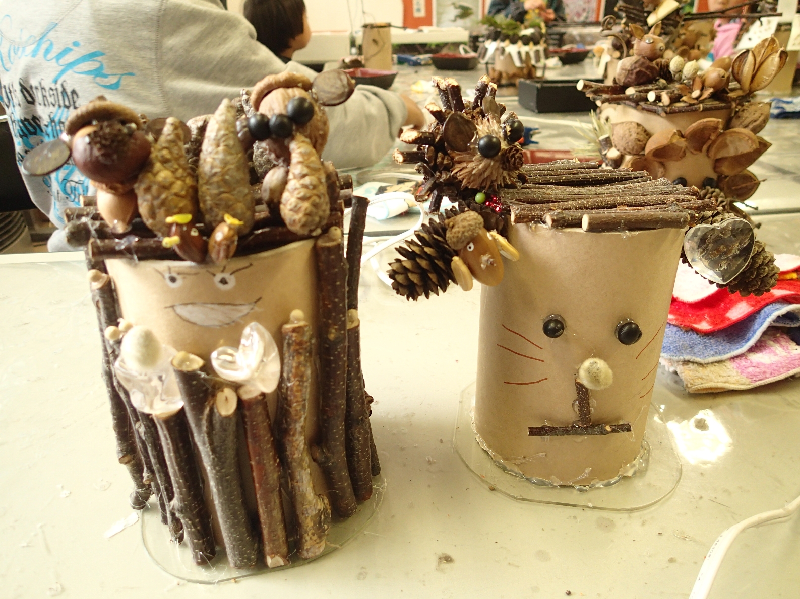 丸い筒を土台にして、木の実などで飾り付ける貯金箱でしたが、