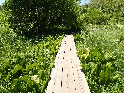 春先には可愛らしく白い花(正確には花ではなく「 仏炎苞」)を咲かせるミズバショウも、初夏を迎える今頃には子ども達の背丈と同じ程までに成長し、すっかりオバケミズバショウと呼ばれるにふさわしいサイズになってしまいました。※写真:木道脇の大きな葉がミズバショウ