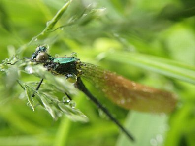 ↑きれいなオレンジ羽に、輝く緑ボディのニホンカワトンボ。