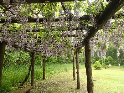 パーゴラ広場の藤棚が見頃のピークを迎え、少しずつ散り始めています。