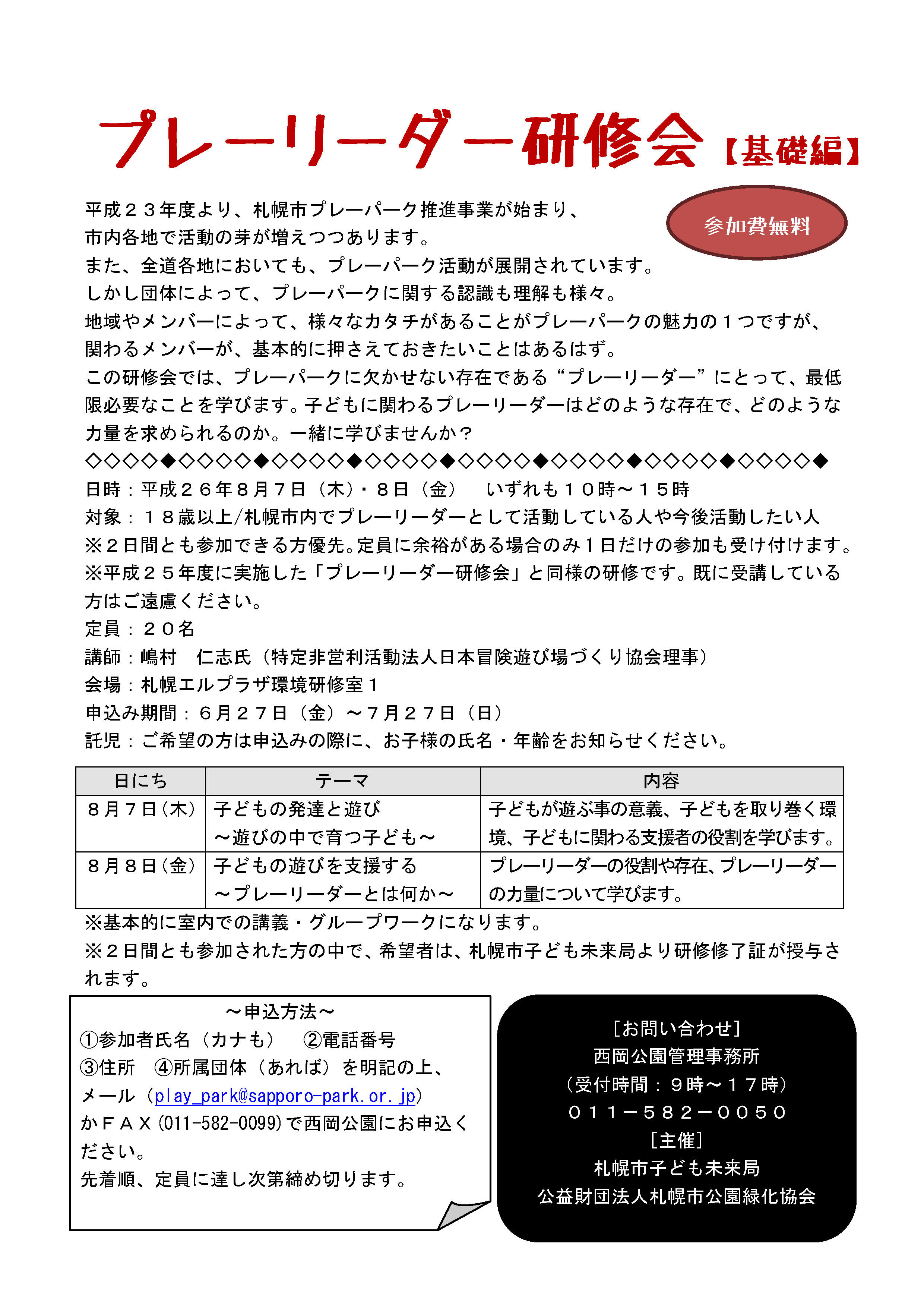 札幌市子ども未来局と共催で「プレーリーダー研修会(基礎編)」を開催します。