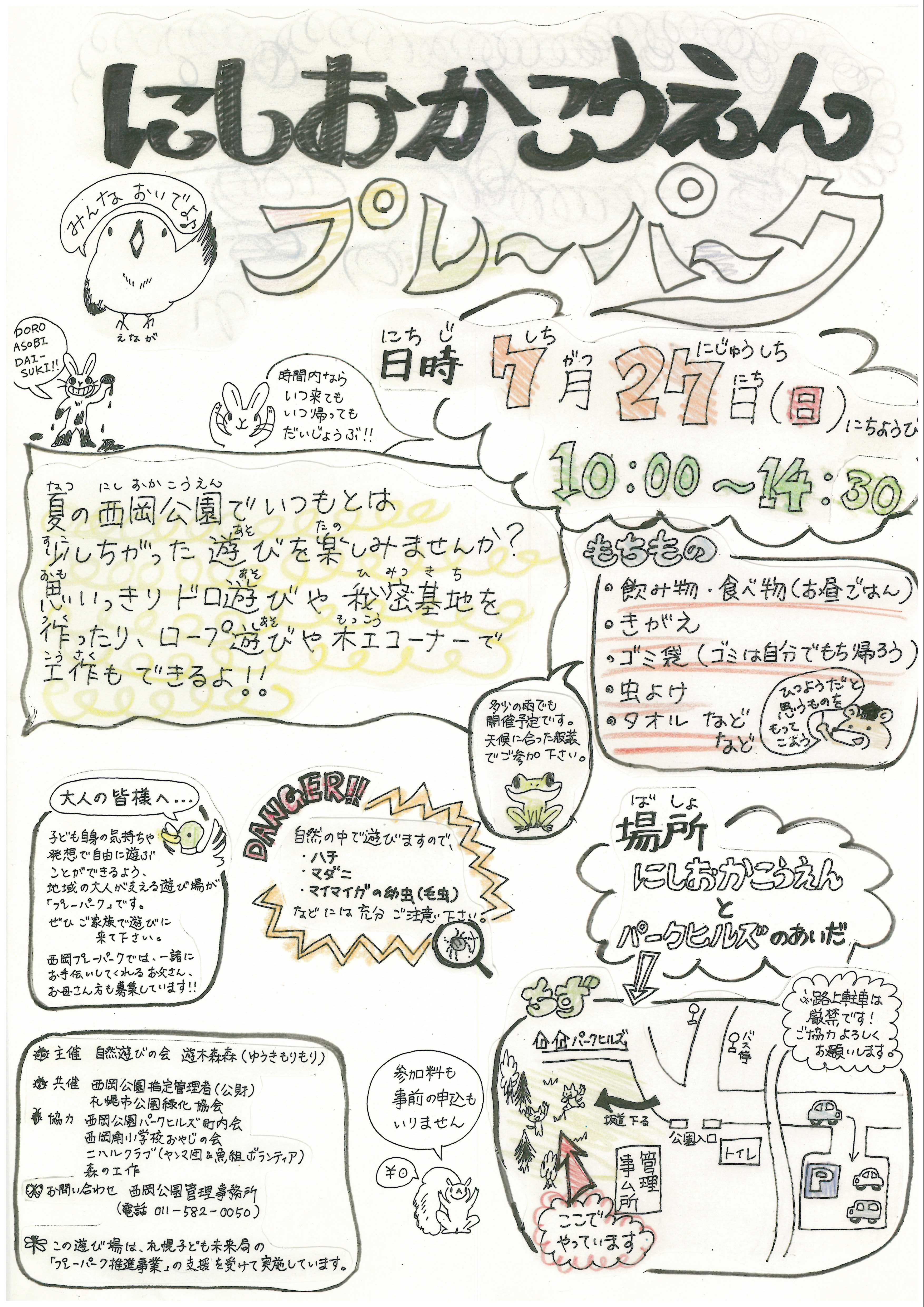 7月27日に、今年度最初の「プレーパーク」を開催します! いつもの西岡公園が、いつもと少し違った遊び場に変身します! 地域のお母さん達の会「遊木森森」主催で、管理事務所や西岡南小学校おやじの会、 森の工作ボランティアも協力して、楽しい遊び場を開催します。