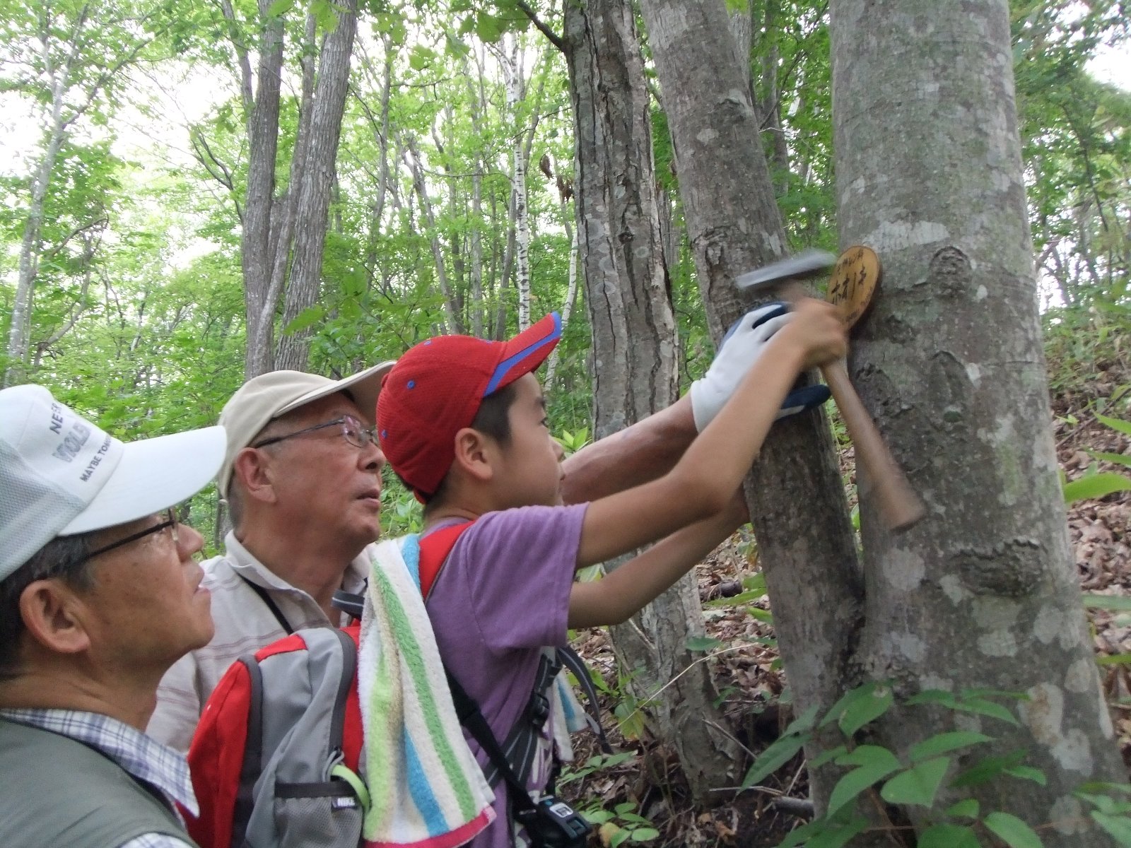 西岡公園では、木に最小限の負担しかかからないように、樹名板をクギでとめています。高い場所にトンカチで打ち付けるのは、なかなか難しかったですね。柔らかくて打ちやすい木、硬くてなかなかクギが入らない木・・・色々でしたね。