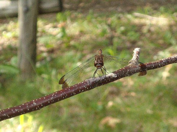 羽の先端が他のトンボと違い、幅広く茶色に変化しているところが特徴的です。