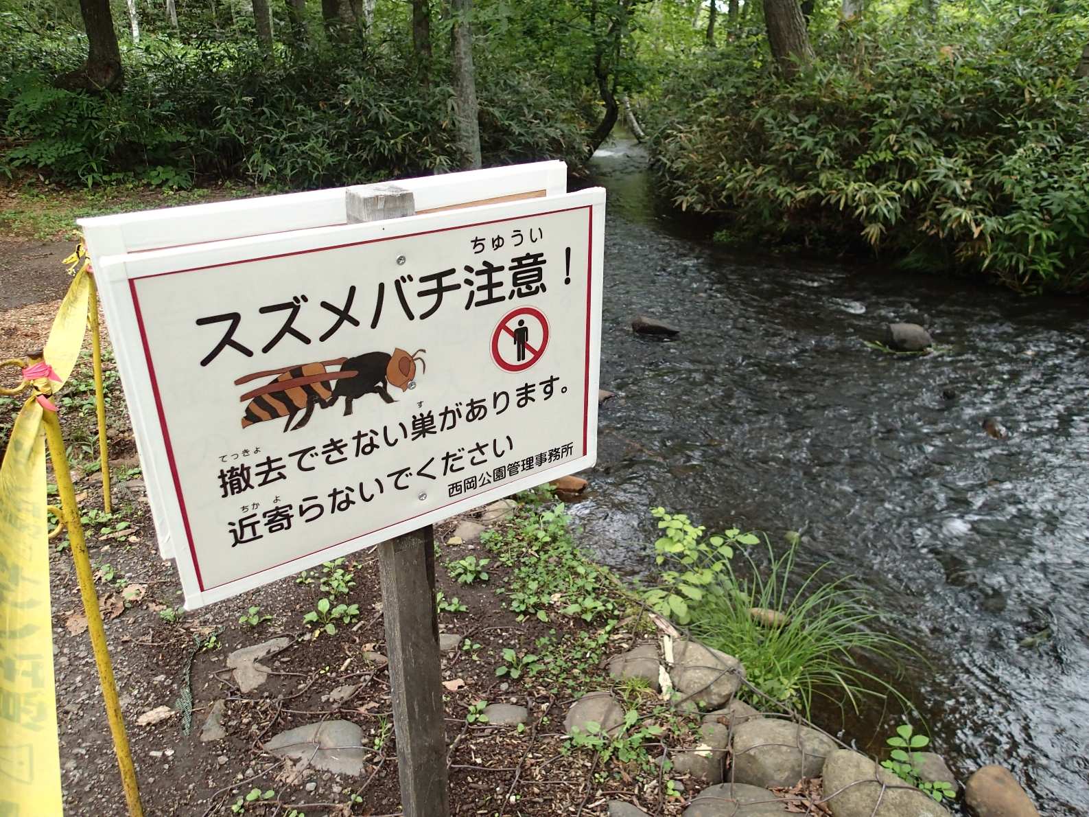 今年は、撤去が難しい巣がいくつかあり、巣の近くに注意看板を出しています。園内を散策される際は充分注意してくださいね!