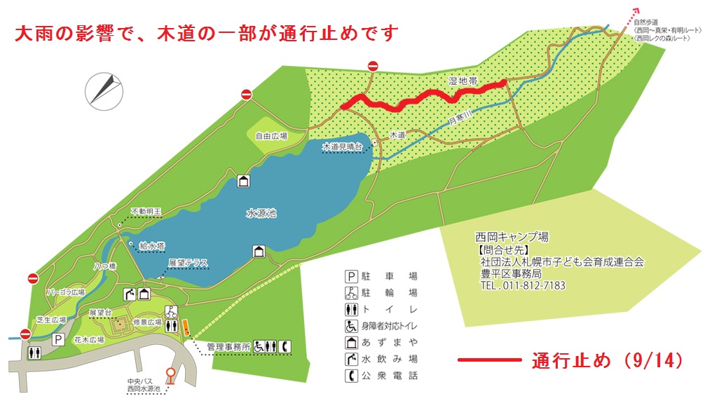 大雨の影響で東側の木道が通行止めになっていましたが、 水位も下がり安全が確認できたことから、一部木道の通行止めを解除しました。今日は、天気も良くお散歩日和ですが、木道が冠水した時に泥をかぶった場所は、木道の上が滑りやすくなっているので、ご注意ください。