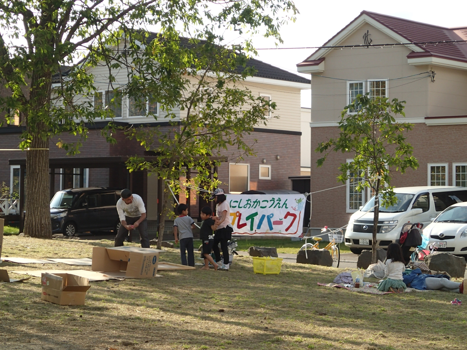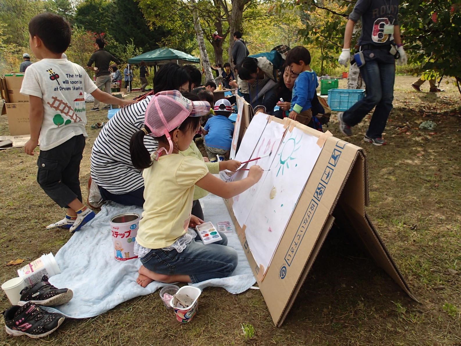 プレーパークを主催している遊木森森のお母さん達は食べ物や小さい子達の遊びを見守り、西岡南小学校おやじの会の皆さんは、ターザンロープや段ボール遊び、森の工作ボランティアの皆さんはたき火や木工作を見守ってくれて、今回も沢山の大人の協力の元、楽しい遊び場を開催することができました。また、子ども未来局のプレーパーク推進事業における活動支援で、