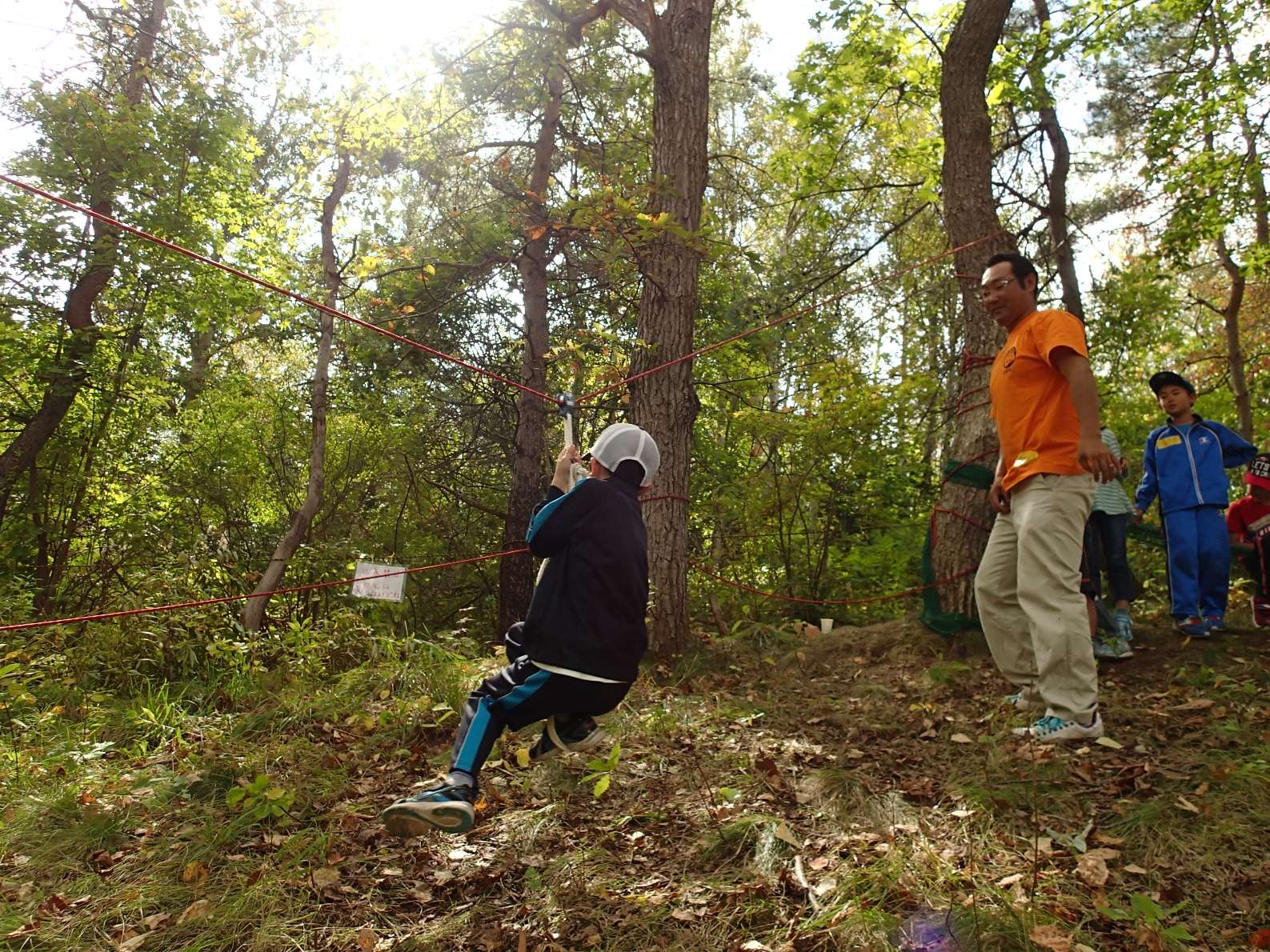 このターザンロープは、ガキ大将の男の子が「作りたい!」と言って始めたのですが、おやじの会のお父さんや子ども達が集まって、お昼頃には立派なターザンロープが完成しました!森の中をヒュンとひとっ飛び!子ども達にも大人気でしたね。