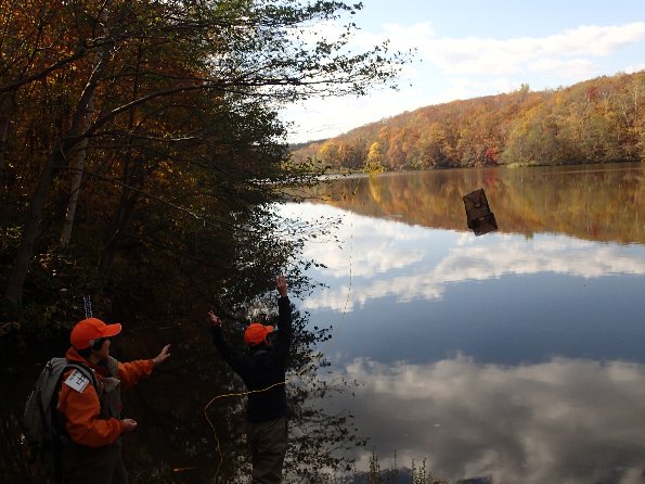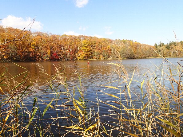 ※真ん中に小さく見えるのは、魚組の隊長です。水源池は深いところもありますが、大体が浅く、タモ網で調査できます。