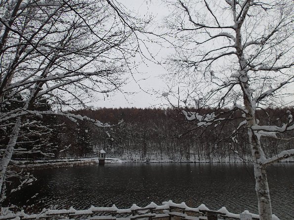西岡公園も昨日まで木の葉に覆われ、秋の風景を楽しめましたが、今朝出勤してみるとあたり一面真っ白、雪景色でした。