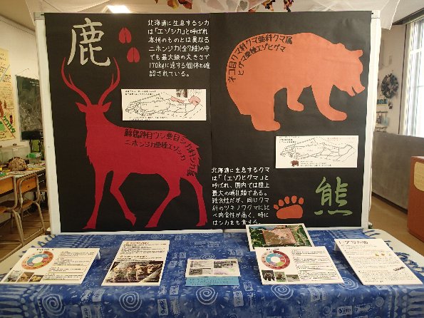 事務所に入ってすぐのところ、最近流行のシカとクマについて作ってみました。