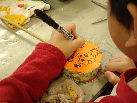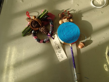 子りす工房らしく、でんでん太鼓の柄は、ササの茎でできていて、両側には木の実を付けました。太鼓の部分には、みんなかわいい絵を描いてくれましたよ~。