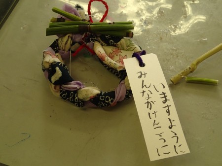 今年は、「でんでん太鼓」と「小さな布のしめ縄」をみんなで作りました。
