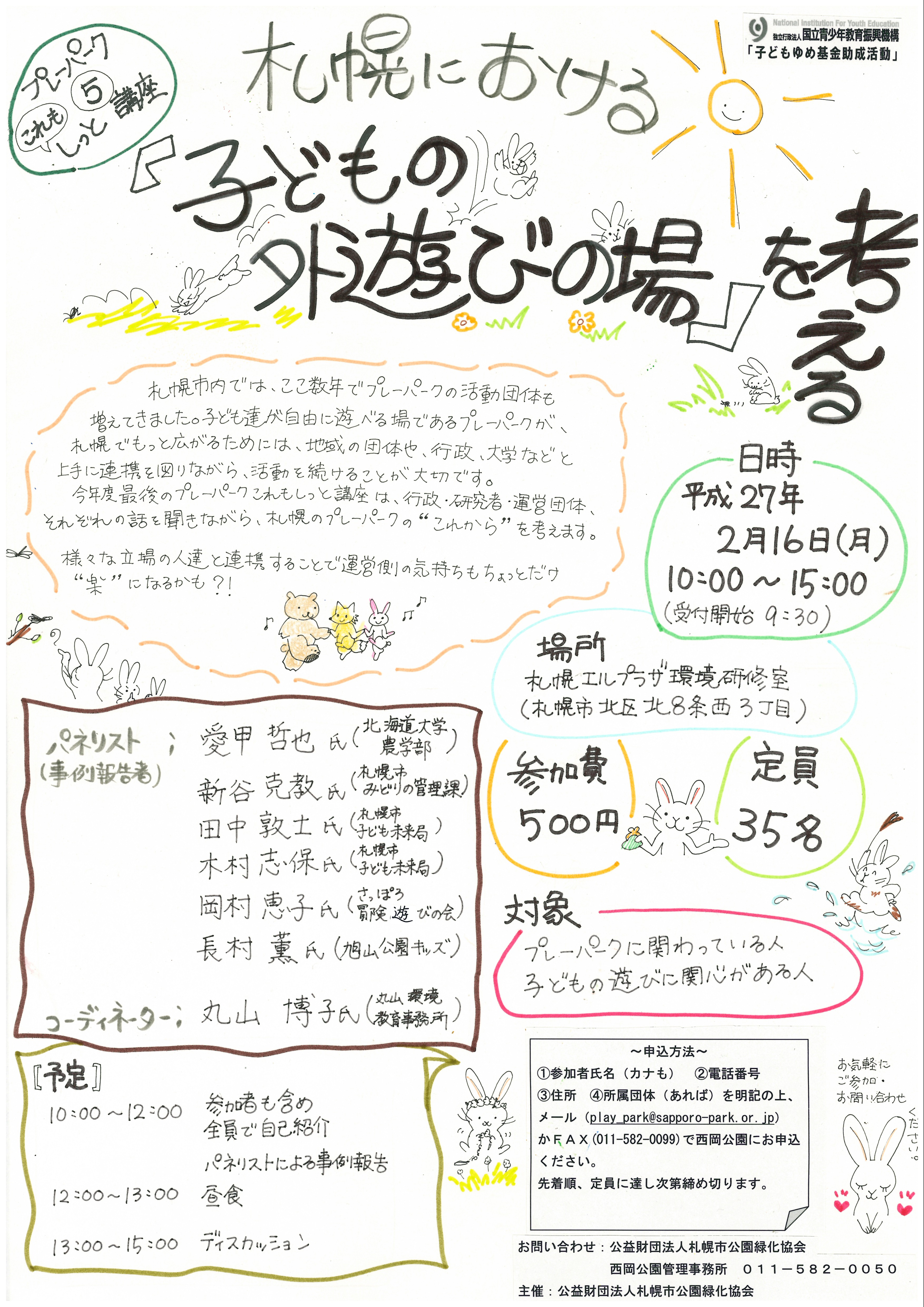 プレーパークこれもしっと講座⑤は、行政・研究者・プレーパーク活動団体など 様々な立場の方をお招きして開催します。 今年度のしっと講座の最終回として、子ども達の外遊びの場の1つである プレーパークのこれからを考える講座です。 皆様のご参加をお待ちしています。