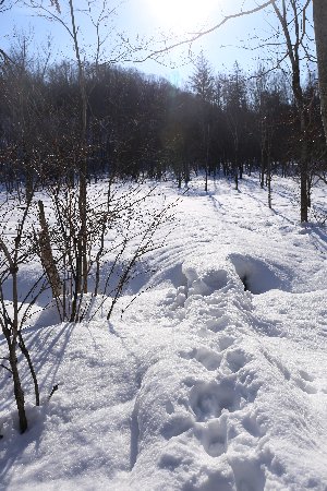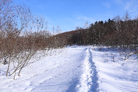 今日の散策路は足元が固く凍り、滑るけれど気をつければ歩きやすい道になています。