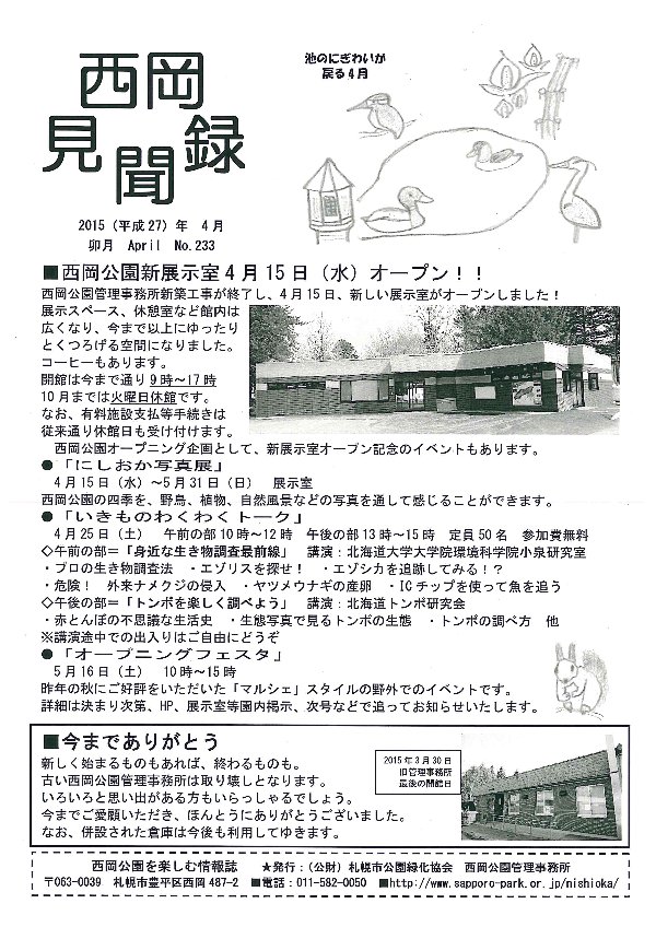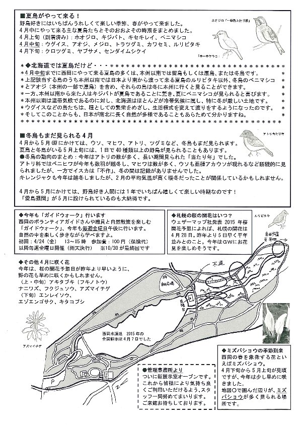 内容は、新展示室についてイベントのお知らせなど、4月から5月にかけての鳥の情報などとなっています。