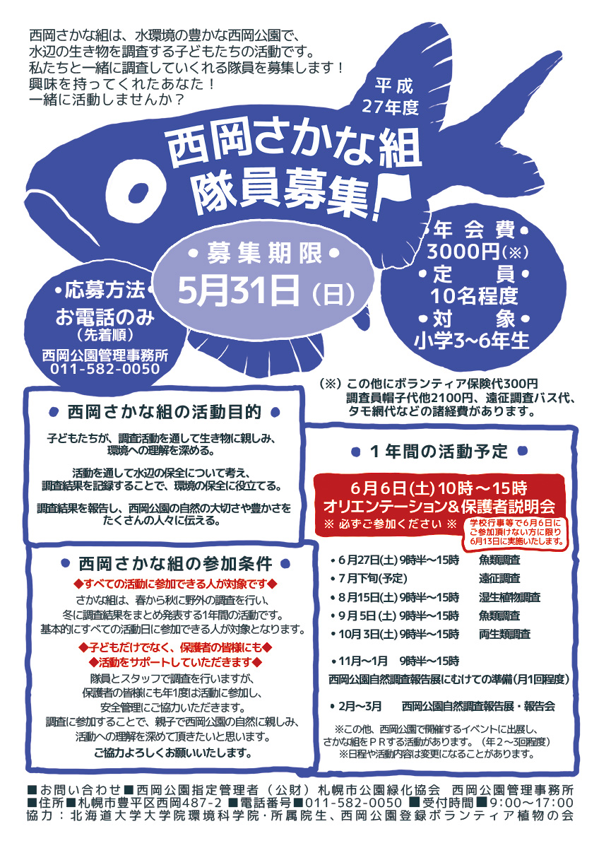 平成27年度「西岡さかな組」新規隊員募集のお知らせ。