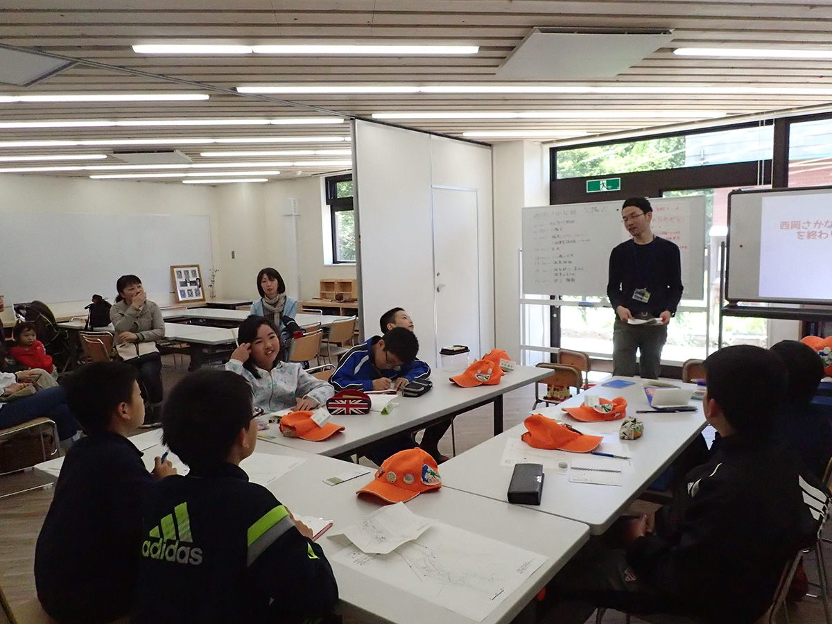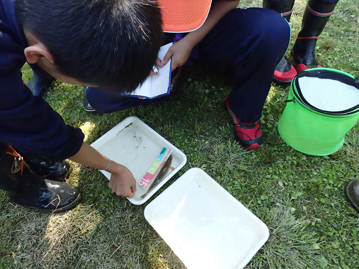 それぞれの種類、大きさを測り、川へ帰して、調査結果をみんなで共有します。