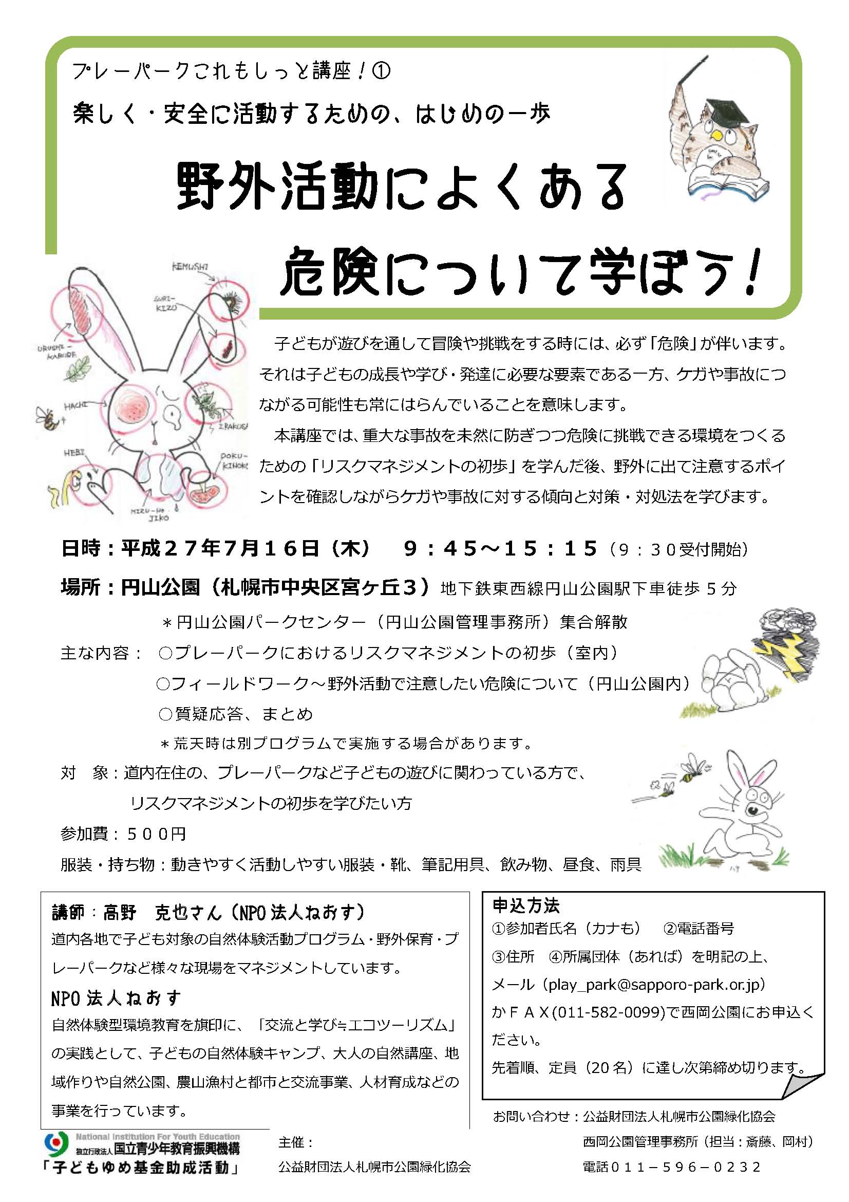 ①参加者氏名(カナも) ②電話番号③住所 ④所属団体(あれば)を明記の上、メール(play_park@sapporo-park.or.jp)かFAX(011-582-0099)で西岡公園にお申込ください。