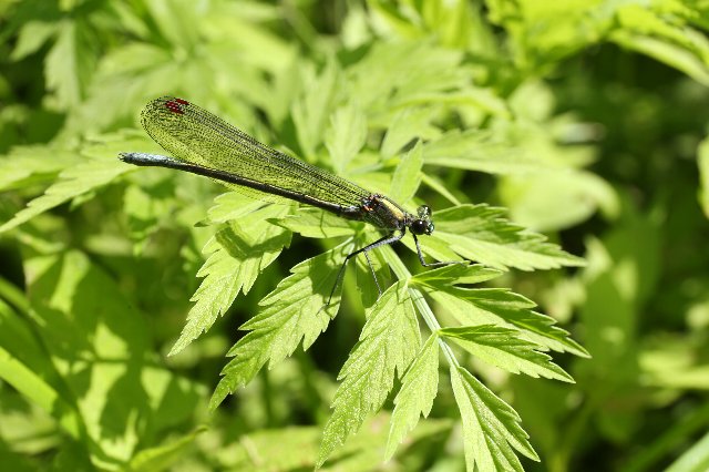透明型の雄、羽の先に赤い印がありますが、雌はここが白い印です。