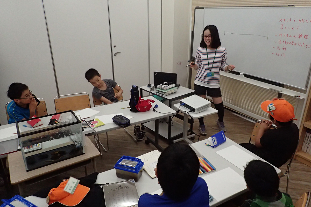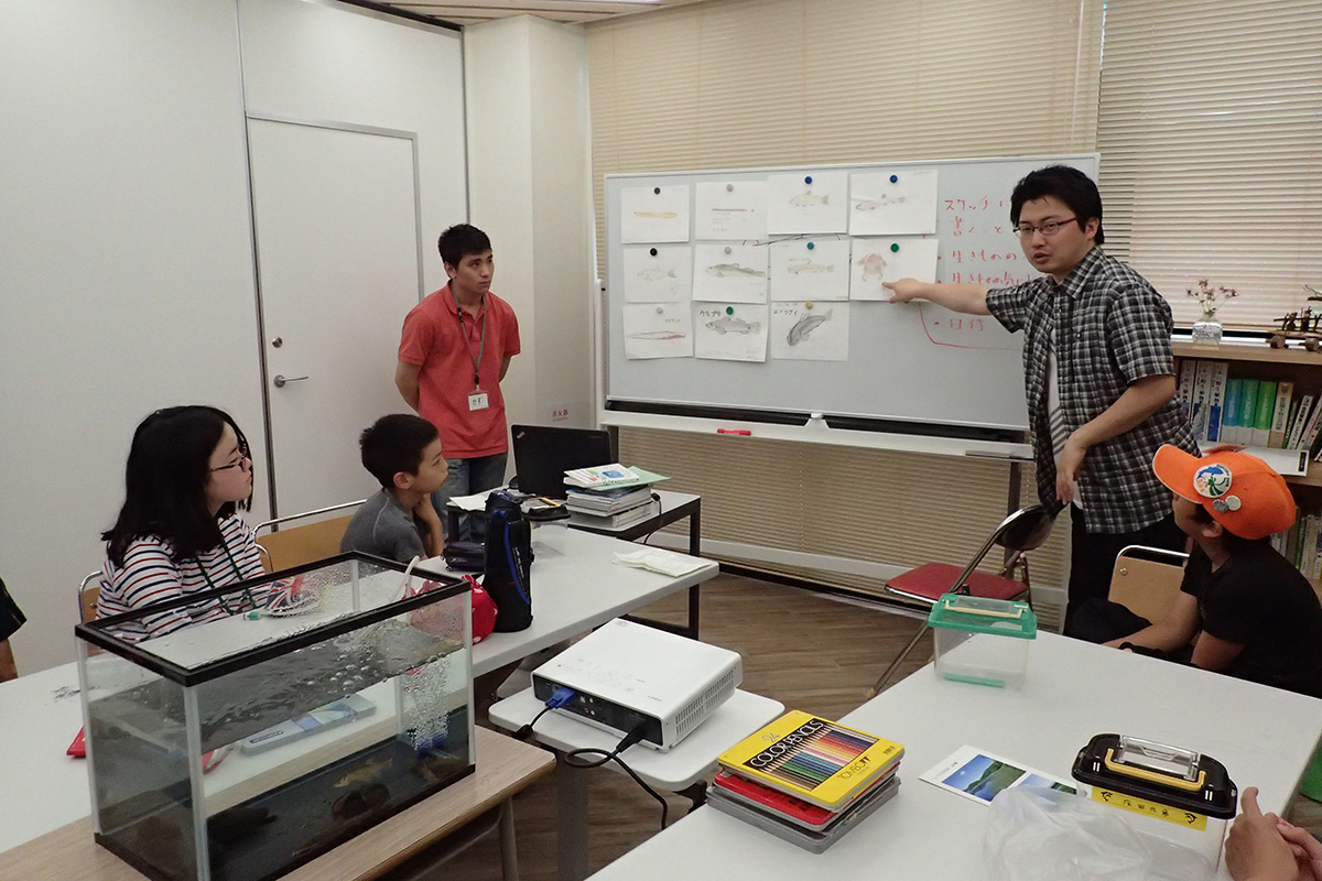 中学生スタッフがみんなに魚類をスケッチするときの基本を教えてくれて