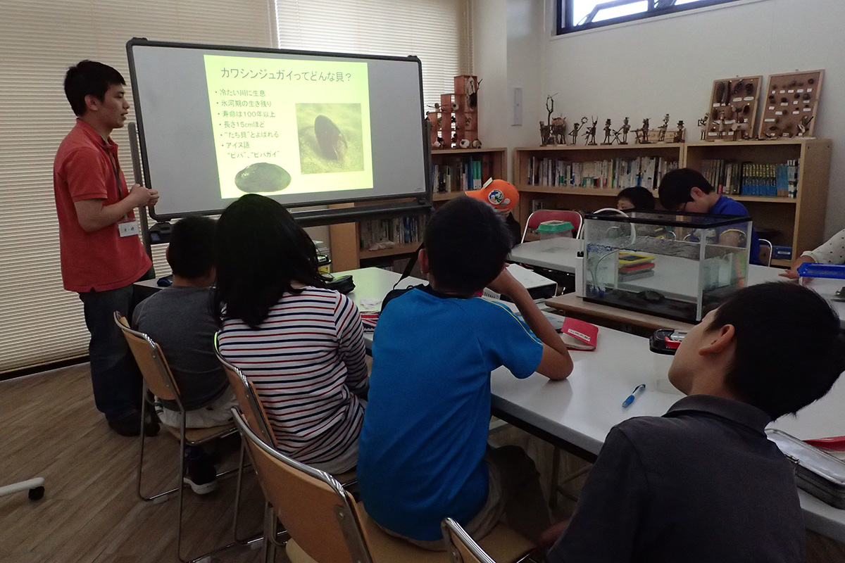 写真を使ってカワシンジュガイがどのように生息しているのかを紹介してくれました。
