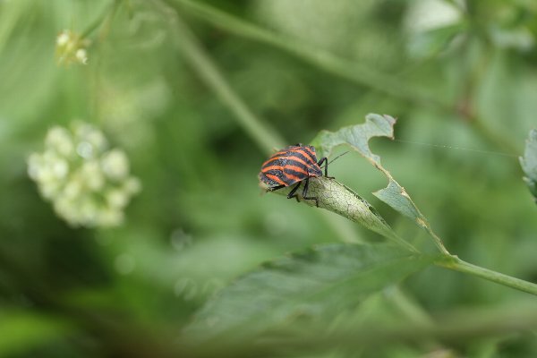 通称「コンサドーレカメムシ」、アカスジカメムシは木道のドクゼリによくとまっています。