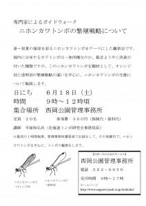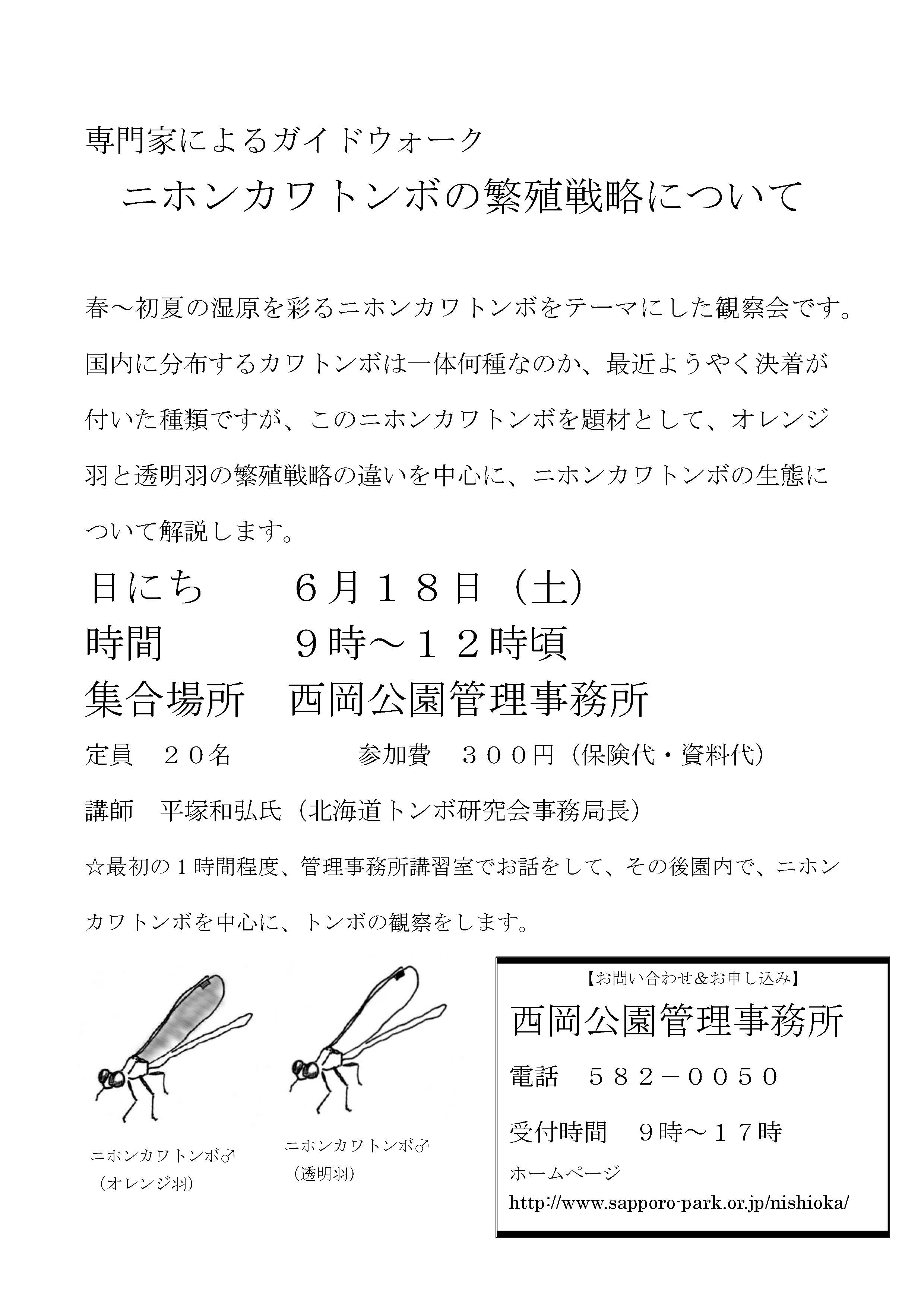 今年初の試みとして、「専門家によるガイドウォーク」を行います。 第一回目は、トンボのおじさんこと平塚和弘氏による「ニホンカワトンボの繁殖戦略について」の観察会です。 20年以上西岡公園でトンボの観察を続けている平塚さんならではのお話が、たくさん聞けるガイドとなっております。 ただいま申し込み受付中です。ぜひご参加ください。