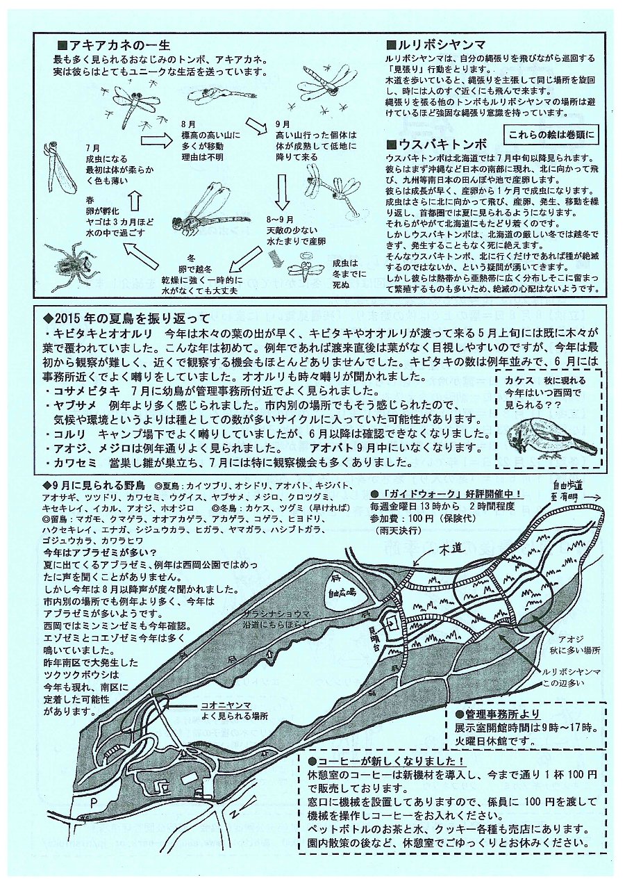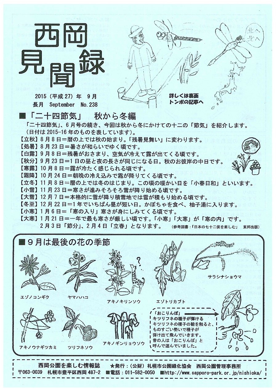 「西岡見聞録」2015年9月号ができました。 今月は、「二十四節季」の立秋以降について簡単にまとめた記事と、最後の花の季節を迎えた9月の花のイラストが表面。 裏面ではアキアカネの生活史のイラスト、ルリボシヤンマとウスバキトンボの説明などです。 展示室入口横の棚にありますので、ぜひお手にとってご覧ください。