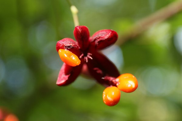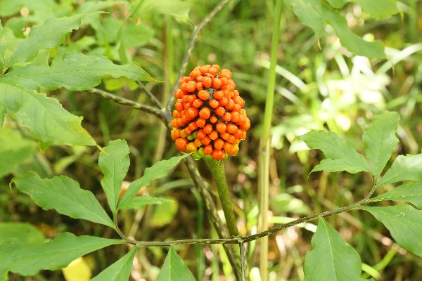 マムシグサの赤い実は光の少ない林床で目を引きます。