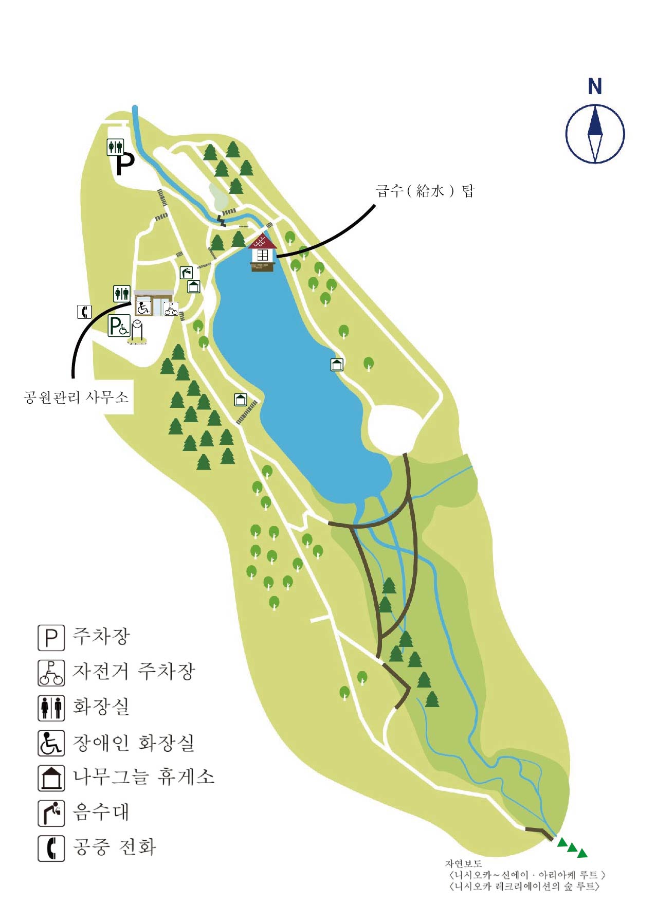 니시오카공원은 연못을 중심으로 쓰키사무 강과상류 지역의 습, 그리고 삼림 등이 우거져 자연이풍부한 공원입니다.