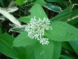 茎を取り囲むように、ギザギザのある4枚の葉がついているのが特徴。上部には、小さな淡紫色か白色のたくさんの小花の集まりがつく。ヒヨドリの鳴く頃には開花するので「ヨツバヒヨドリ」と言う。