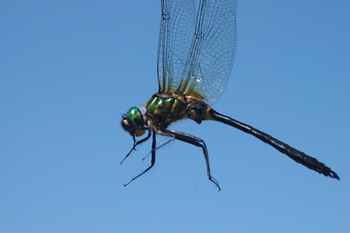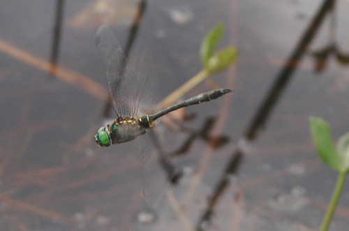 春先に池で縄張りをはる姿が見られます。全身は茶色の感じですが、複眼はエゾトンボ特有の美しい緑色です。