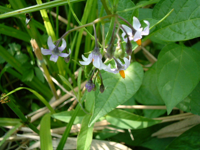 | 木道沿いでよく見られる湿原の植物。花は、紫色でナスの花に似ている。実もナスの実に似ていて、緑色から赤色に変化する。 |