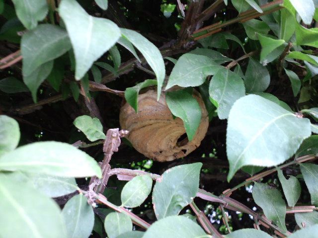 ハチの巣があるよ~と、豊平区少年軟式野球連盟のコーチの方たちが教えてくれました! なるほど、握りこぶしほどの大きさのハチの巣が、ニシキギの植え込みの中にありました。 ハチの巣はスタッフで撤去しましたので、安心して、野球を楽しんで下さいね。