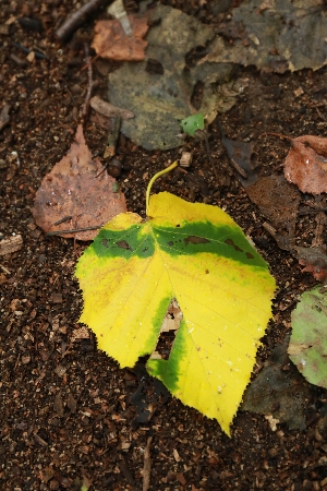 西岡中央公園の林を歩いていると、何らかの理由で秋を迎える前に落ちてしまった木々の葉を幾つか見つけました。