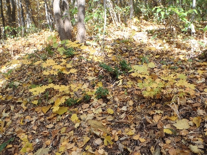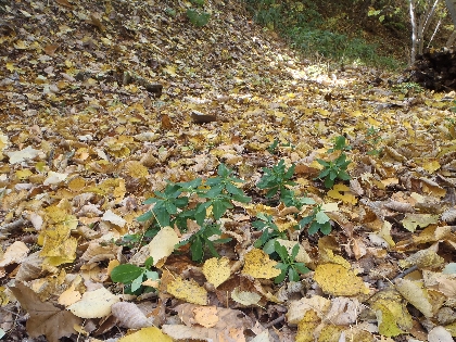 ナニワズの周りの黄色い葉はハウチワカエデの幼木。