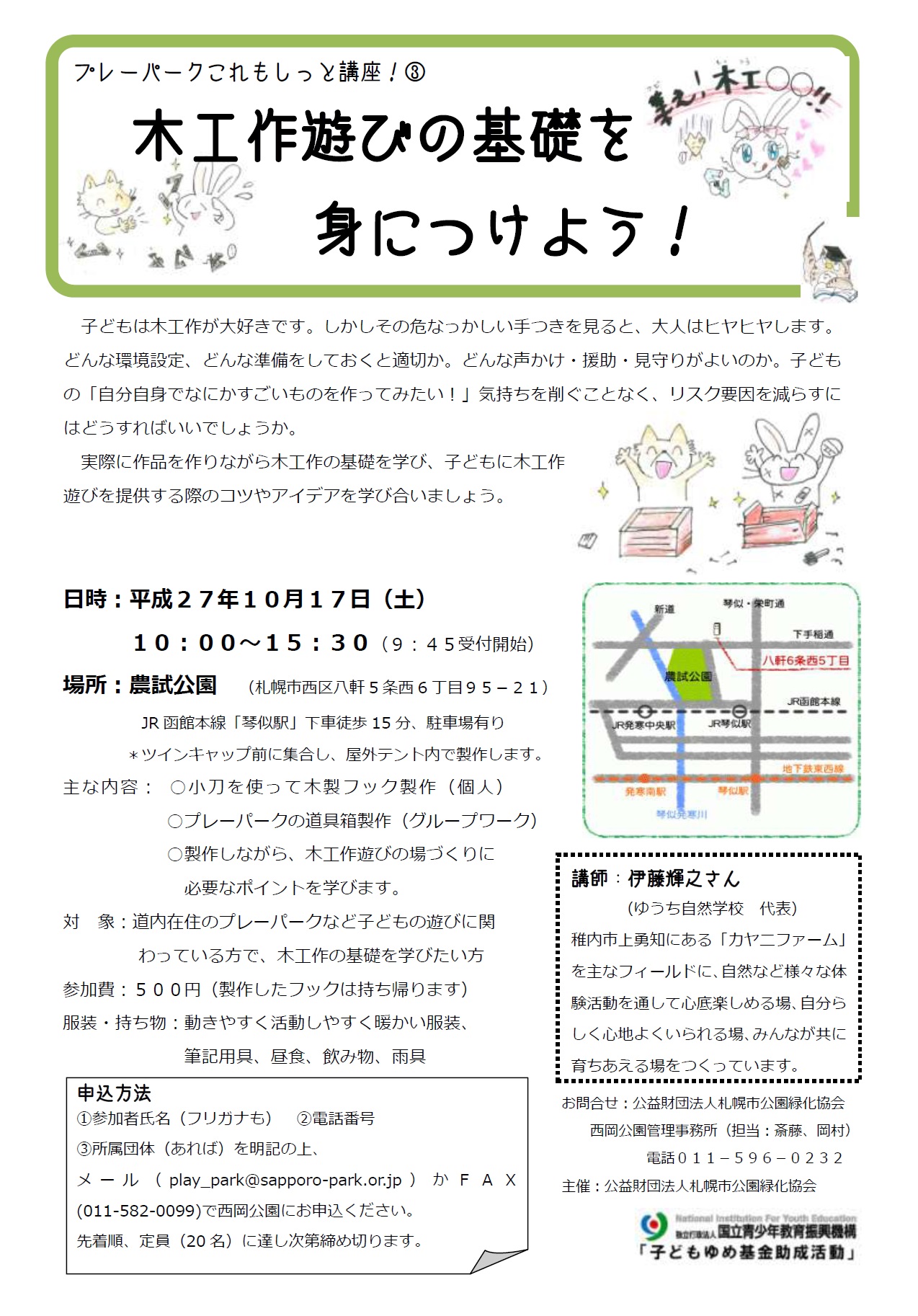 | 対 象 | 道内在住のプレーパークなど子どもの遊びに関 わっている方で、木工作の基礎を学びたい方 |