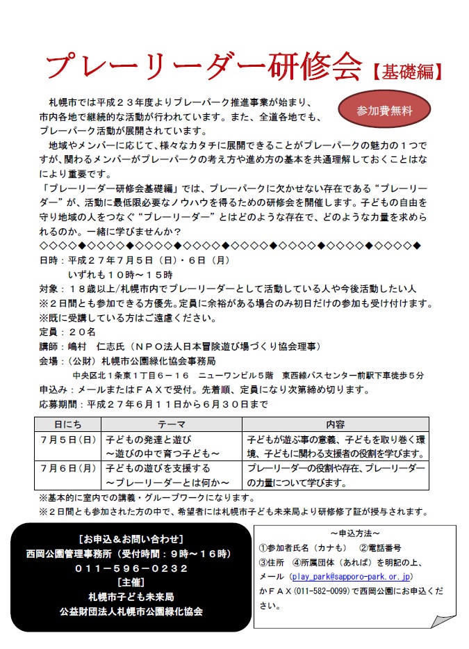 皆様のご参加をお待ちしています!プレーリーダー研修会チラシ