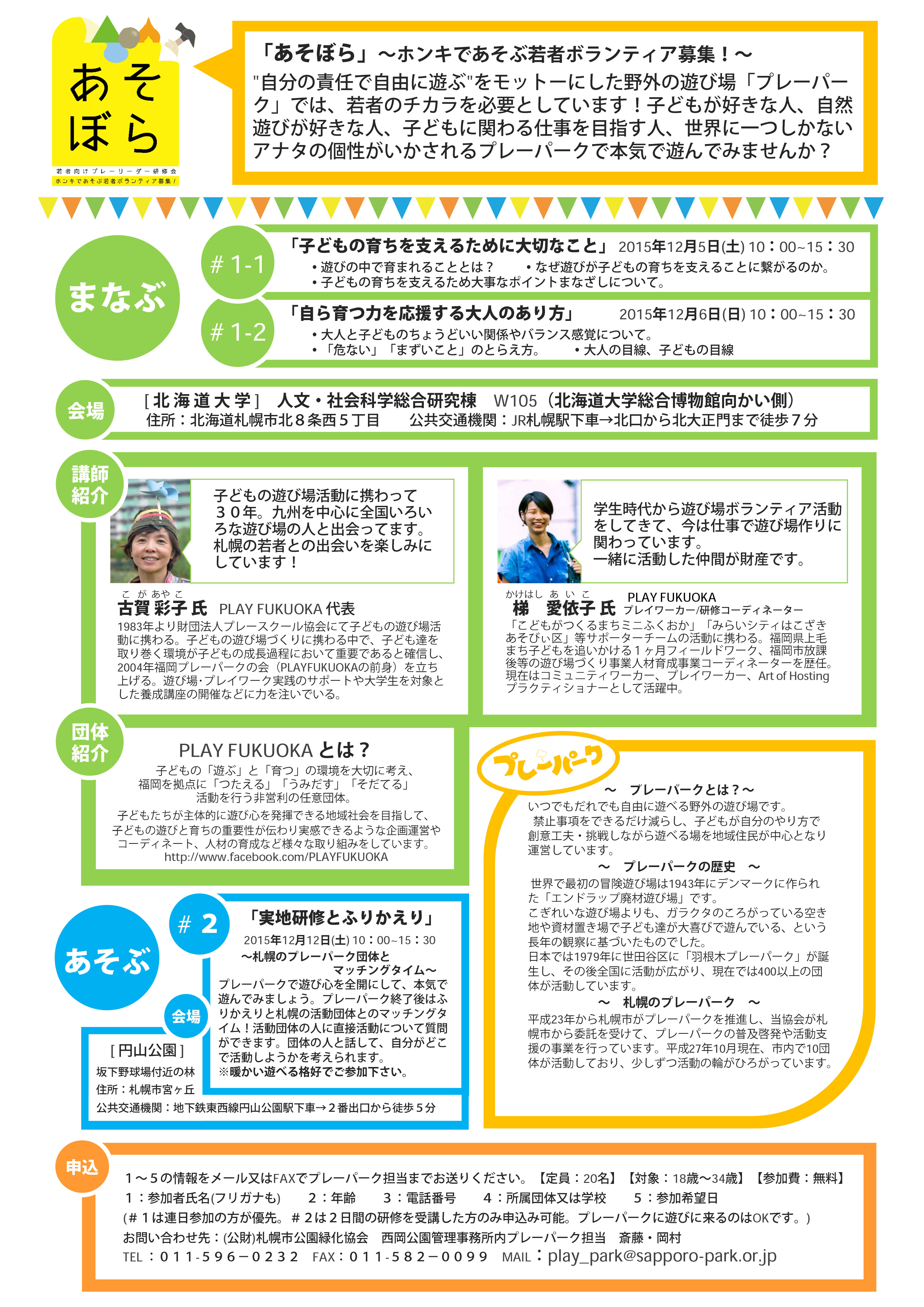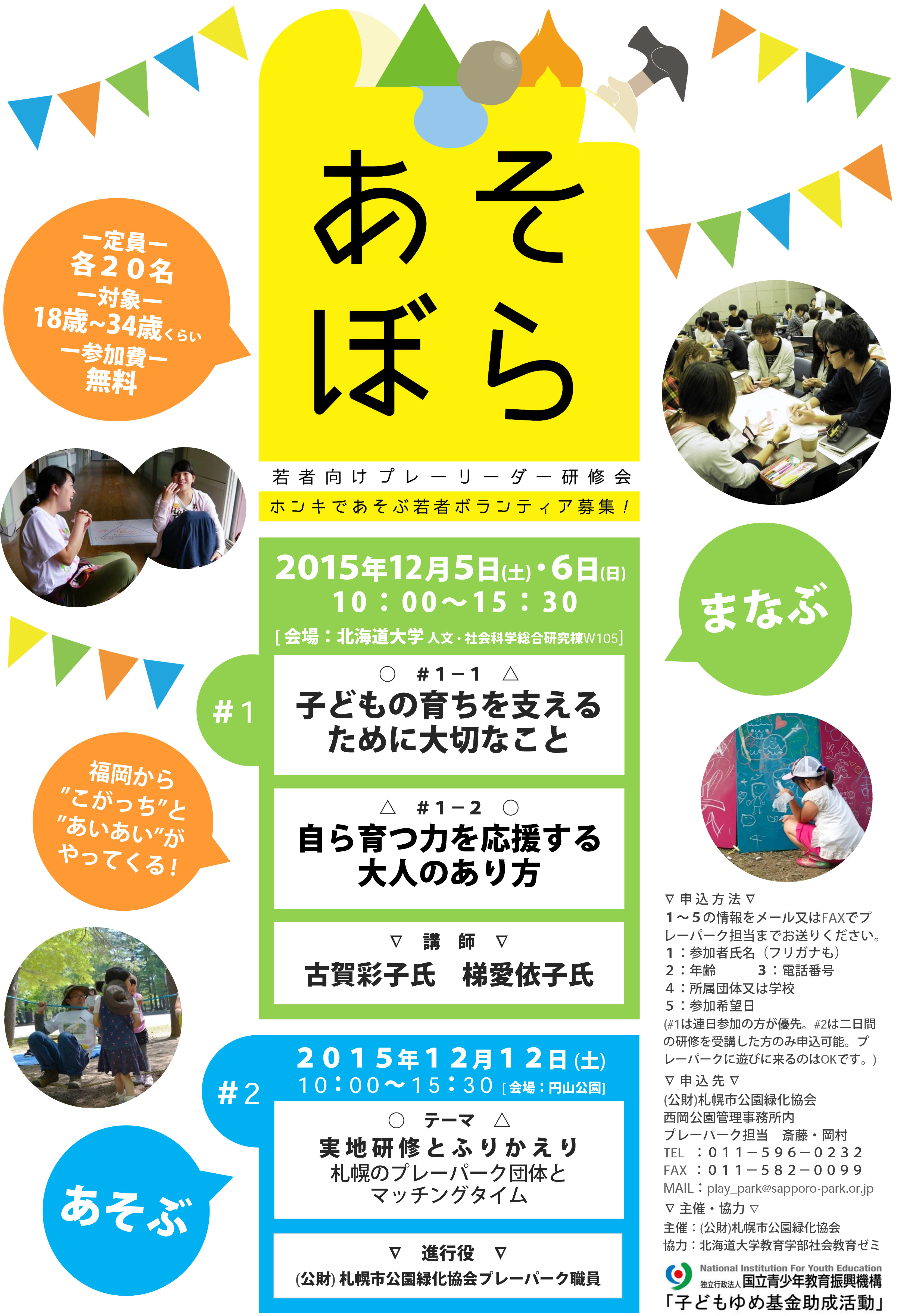 定  員 各日程20名 (2日間参加の方優先。1日だけの参加も可) ←2日間の研修を受講した方のみ申込み可能。プレーパークに遊びに来るのはOKです。