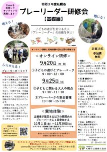 先日から申込受付を開始している、令和3年度札幌市プレーリーダー研修会ですが、新型コロナウイルス感染拡大状況を考慮し、オンラインでの開催へ変更させていただくことになりました。