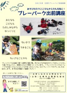 現在、令和2年度のプレーパーク出前講座の申し込みを受け付けています。 「プレーパークのことをもっと詳しく知りたい!」「自分の地域でもプレーパークをやってみたい!」というかたにおすすめです。 プレーパーク担当まで、お気軽にお問い合わせください。 詳細はこちらのリンクでご確認ください。