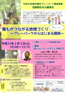 ② 講演「見えない力」が子どもを伸ばす ③平成30年度プレーパーク事業実施団体が、一年間の活動報告を行います。 |