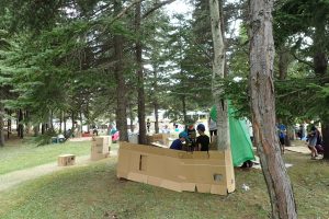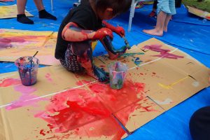 子どもたちは、夏ならではの水のかけあいをしたり、絵の具でダンボールや自分の手足に絵を描いたりするなど、普段できない遊びを楽しんでいました。また、初めて使うダンボールカッターに夢中になり、ダンボールで家を作っている子など、自分で遊びを展開させていく様子がたくさんありました。子どもも大人も皆イキイキとして楽しそうに遊んでいたのが印象的でした。