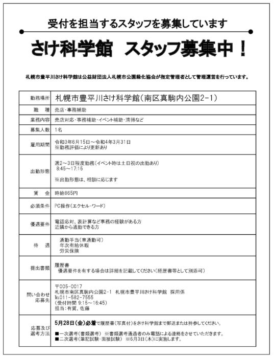 問合せ先 〒005-0017札幌市南区真駒内公園2-1 札幌市豊平川さけ科学館 採用係